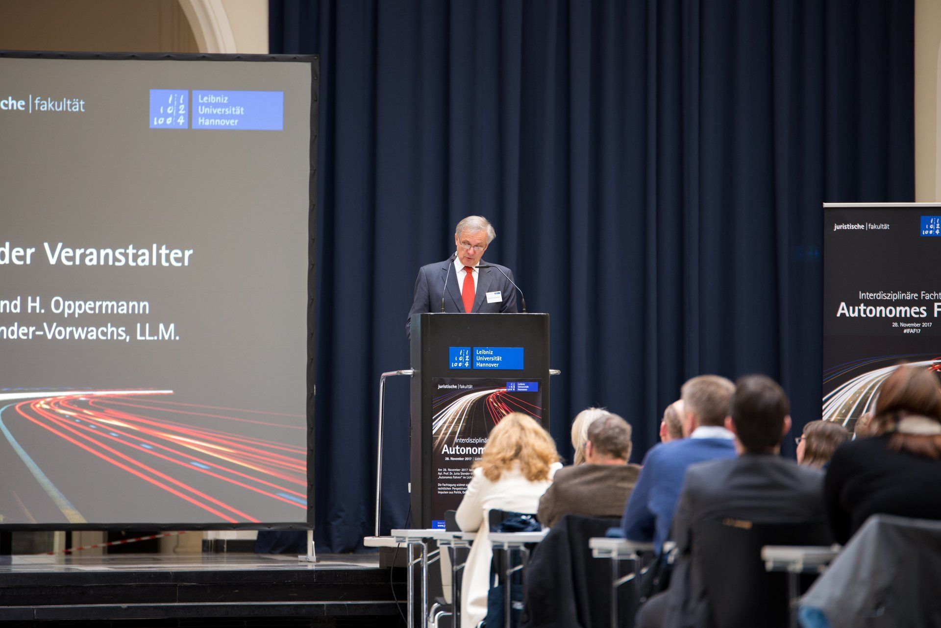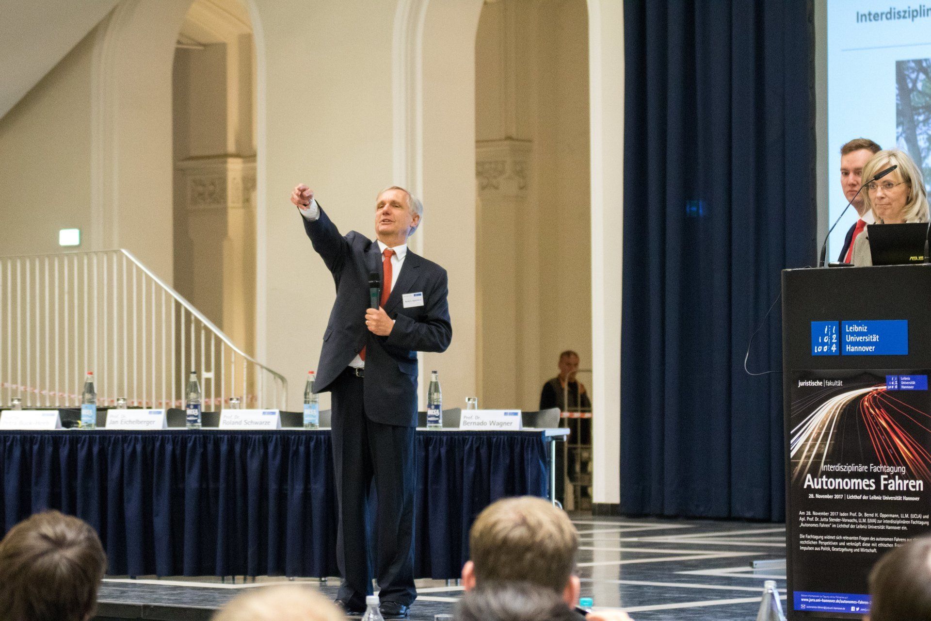 Am 28.11.2017 fand im Lichthof der Leibniz Universität Hannover die interdisziplinäre Fachtagung "Autonomes Fahren" unserer Direktoren Prof. Oppermann und Prof. Stender-Vorwachs statt.